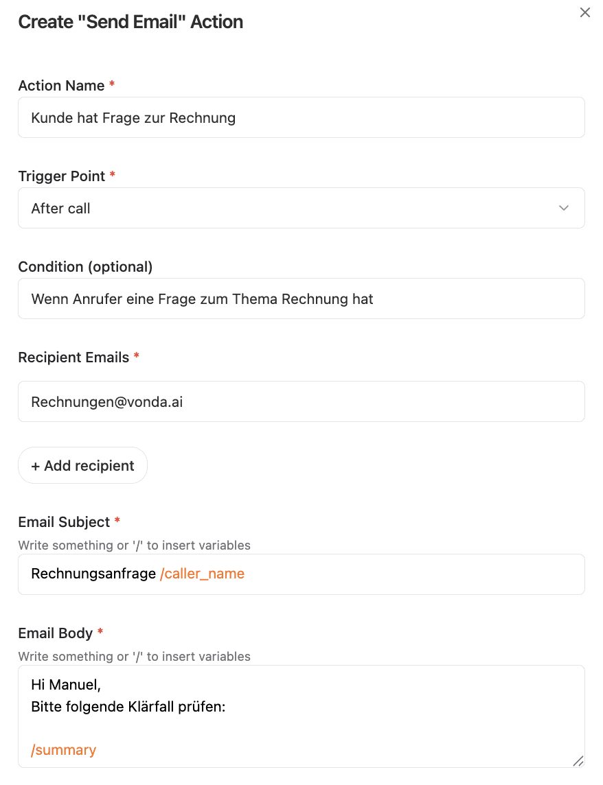 Sende automatisch Follow-ups, Infos oder Bestätigungen. Dein Assistent informiert Kund:innen und Teammitglieder sofort nach während und nach jedem Gespräch.